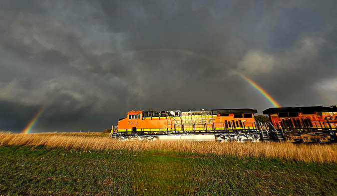 Somewhere over the rainbow, Conductor Colby Slaymaker captured this stunning scene. A BNSF locomotive rests beneath a dramatic Nebraska sky, framed by a vivid rainbow stretched across the field south of Blue Hill after a storm.