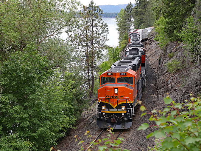 A BNSF train hauling lumber winds through the wooded hills near Loon Lake, Washington, standing out against the natural backdrop of evergreens and rocky terrain.